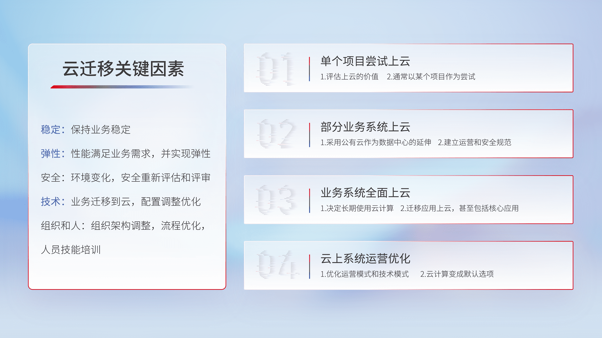 结合实际业务,,,从规划设计、、、云平台选型、、、云原生改造、、、数据迁移、、、集成交付,,迁移全过程为客户识别最佳上云路径,,,,做好风险识别管理,,,设计网络架构、、、身份权限、、、安全审计合规、、、、操作审计、、、日志审计、、、监控告警策略、、、、多站点容灾设计等,,,对云上基础设施进行整体规划,,,,提升IT治理水平,,,,以满足弹性、、高可用、、、、高性能的需求。。。