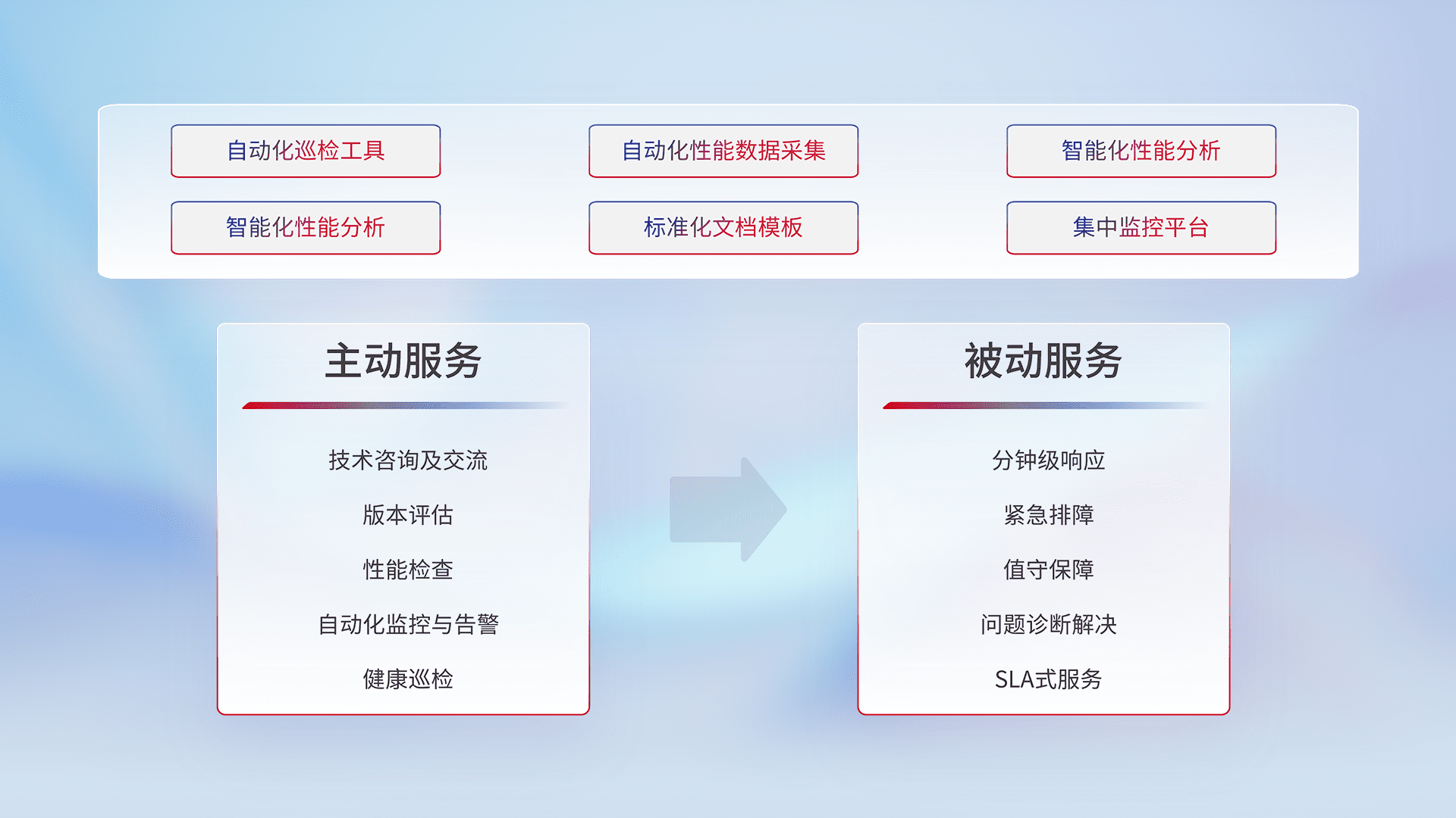 智能化工具和标准化文档,,保障服务质量,,提供主动服务(包含技术咨询、、、、版本评估、、性能检查、、、自动化监控与告警、、健康巡检)和被动服务包含(分钟级响应、、紧急排障、、、、值守保障、、、、问题诊断解决、、、、SLA服务)。。